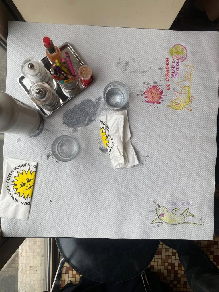 De vertrouwde clientèle heeft plaatsgemaakt voor een nieuwe generatie Parijzenaars met een uitgesproken gevoel voor stijl, die de plek zowel tot lunchadres als avondlijke ontmoetingsplek maakt. Overdag schuif je aan voor een snelle lunch tussen twee afspraken door. ’s Avonds krijgt de ruimte een zachtere, intiemere sfeer, perfect voor een date. De papieren tafelkleden, waarop je vrij kunt tekenen met Crayola, geven het geheel een speelse, bijna nostalgische toets. Zodra de lente zich aandient, worden de grote schuiframen een van de grootste troeven van het adres, waardoor een zachte voorjaarsbries naar binnen stroomt.