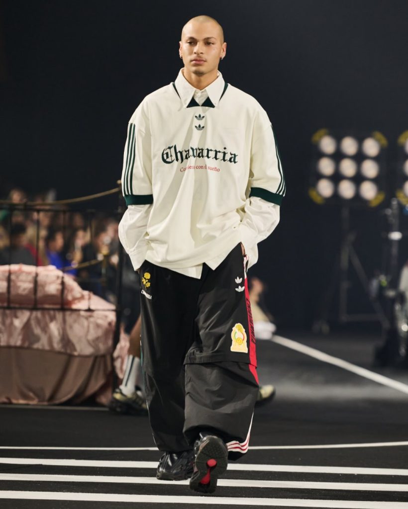 Een samenwerking met geschiedenis, die dit seizoen een bijzondere weerklank krijgt in aanloop naar het Wereldkampioenschap voetbal 2026 in Canada, de Verenigde Staten en Mexico, het land van herkomst van de ontwerper. Als officiële sponsor wordt adidas hier een expressief platform voor Willy Chavarria. Geen eenvoudige herinterpretatie van het Mexicaanse shirt uit 1986, maar een globale visie. Herwerkte voetbalschoenen, een bal nonchalant onder de arm, baggy shorts versierd met de Mexicaanse vlag. De aanwezigheid van Marcelo op de catwalk versterkt dit eerbetoon aan de voetbalcultuur.