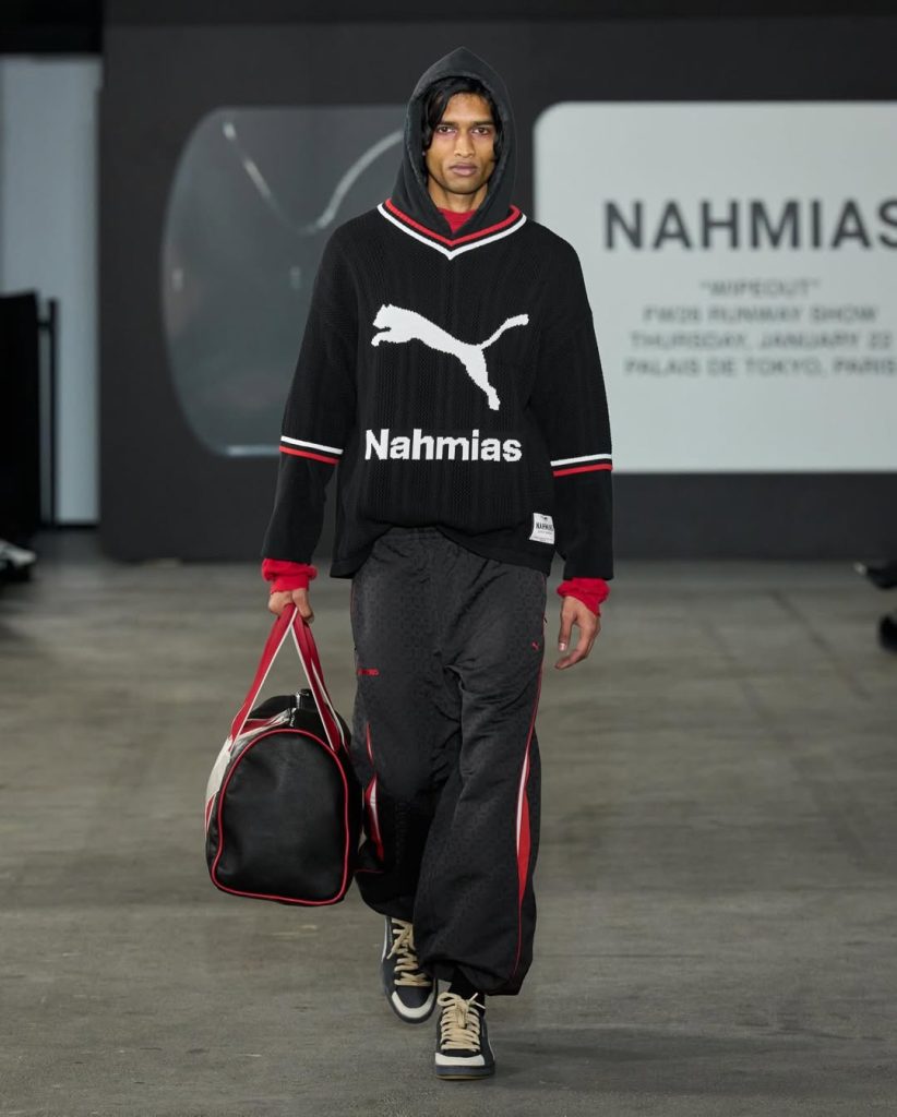 Terwijl Puma zijn aanwezigheid versterkt via events, heruitgaven en de lancering van een platform sneaker, slaat het Duitse merk de handen ineen met het Californische label Nahmias. Gespot op de Parijse catwalk verschijnt deze samenwerking op een strategisch moment, nu het fenomeen Marty Supreme, mede populair gemaakt door Timothée Chalamet, steeds meer zichtbaarheid krijgt. Een alliantie die duidelijk inzet op cultureel bereik.