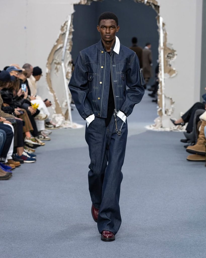 Na een hommage aan James Dean vorig seizoen zetten Sacai en Levi’s hun dialoog rond denim voort. Dit keer verschijnen spijkerjacks onder maatpakken, spelend met verrassing en gelaagdheid. Een rijke voorstel, trouw aan het hybride DNA van het Japanse label. Parallel onthult Sacai een derde samenwerking met A.P.C., waarin motieven uit de archieven van het Franse huis opnieuw worden geïnterpreteerd.
