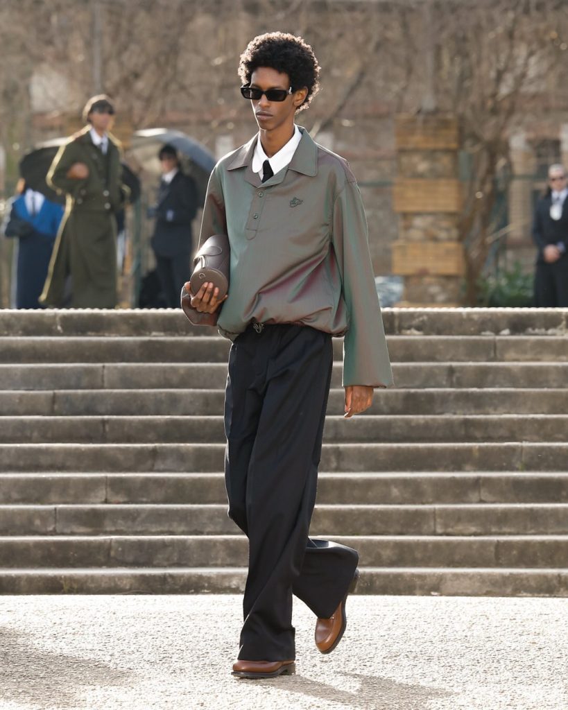 Bij Dries Van Noten componeert Julian Klausner voor zijn tweede collectie aan het hoofd van de mannenlijn een soort patchwork. De eerste silhouetten ademen een bijna kinderlijke onschuld om vervolgens te verschuiven naar referenties aan de wintersport van de jaren zeventig. Strepen, knitwear, sjaals en tassen dialogeren met elkaar terwijl de materialen subtiele contrasten opzoeken. Wol voert de boventoon, zijde sluipt binnen en creëert silhouetten met een zeldzame vloeibaarheid binnen de mannelijke garderobe. Onder de titel The Art of Moving On stapelt de collectie lagen, tijdperken en emoties op elkaar als een uitnodiging om vooruit te gaan zonder het verleden los te laten.