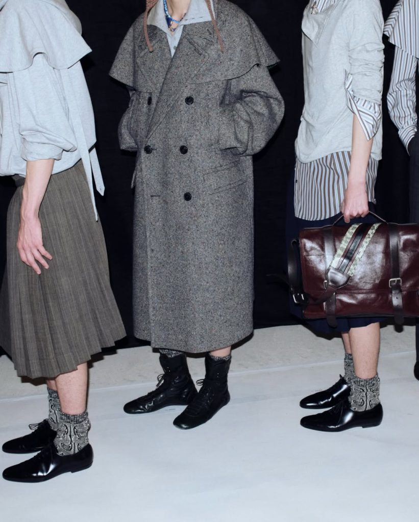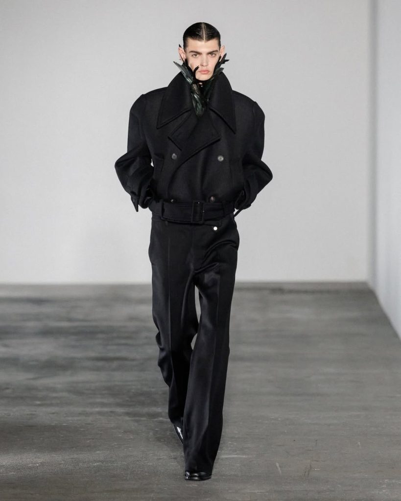 Yohji Yamamoto sluit af met een radicaal andere en bijna post apocalyptische visie. De silhouetten camoufleren zich, beschermen zich en wikkelen zich in lagen. Hoeden gemaakt van flessendoppen, officiersjassen die flirten met camouflageprints en omgeleide accessoires dragen een onderliggende thematiek van overleving. Een sterk moment van deze Fashion Week is de aanwezigheid van de Frans Congolese rapper Jolagreen die twee keer de catwalk betreedt en de show afsluit. Hij belichaamt een meervoudige mannelijkheid op het kruispunt van tijdperken en identiteiten.