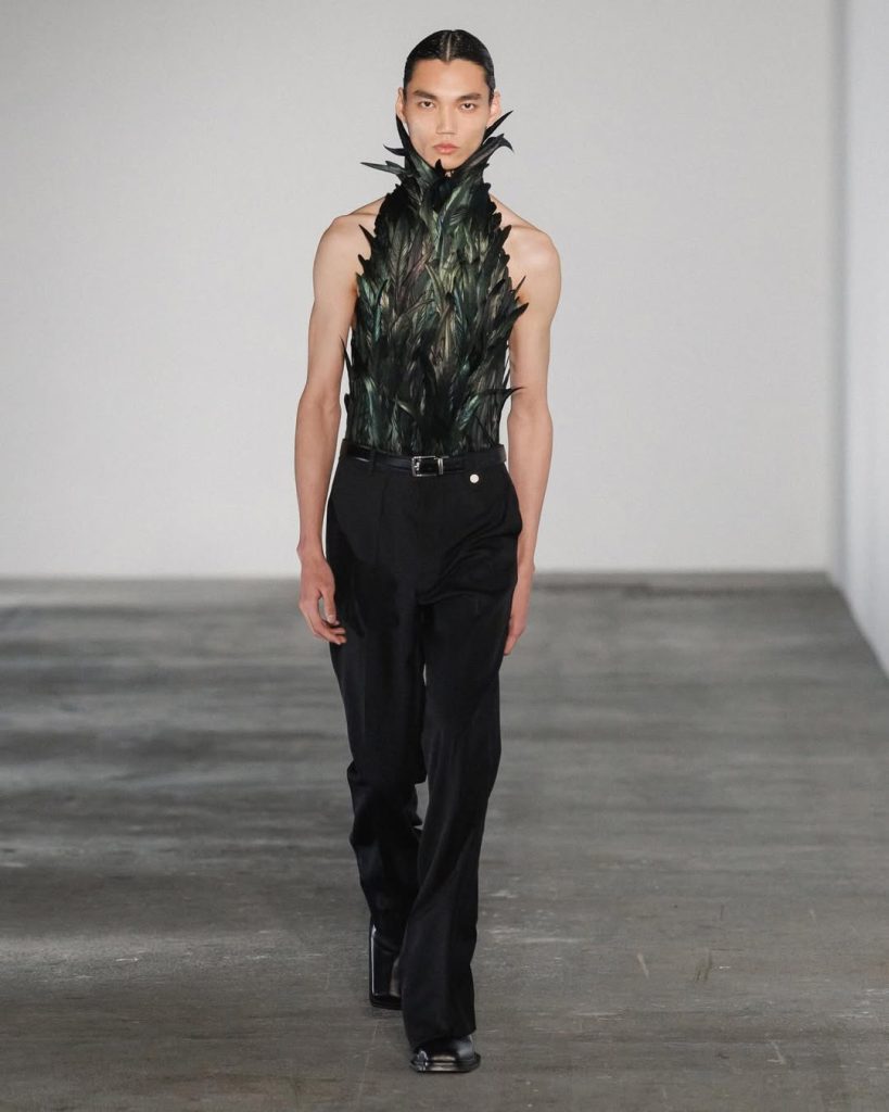 Deze Parijse editie valt ook op door een uitgesproken chromatische vrijheid. Bij EGONLAB nemen veren de plaats in van hemden. Ze sluiten aan op het lichaam en verschijnen in heldere, vibrerende tinten. De kille en monochrome silhouetten maken plaats voor een expressieve en bijna gevoelige vorm van mannelijkheid waarin kleur en materiaal een eigen taal spreken.
