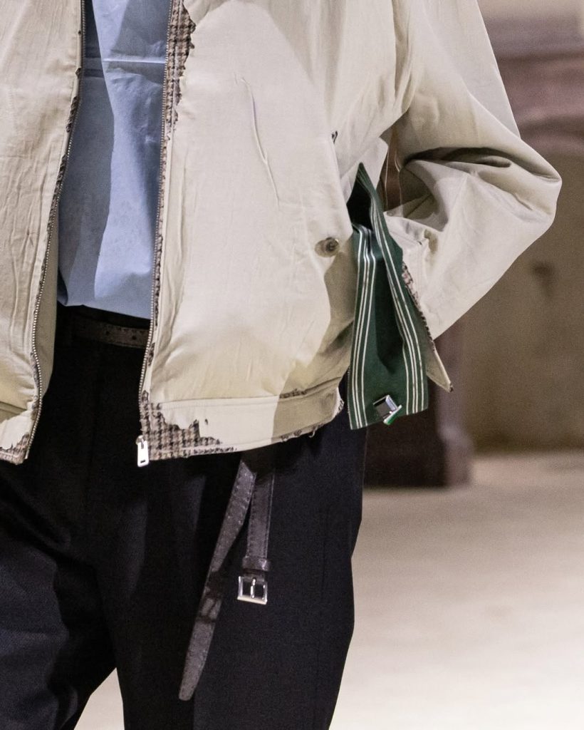 Daarnaast lijkt een leren jas aangespoeld op het hout. De vele pins die hem bedekken vormen een duidelijke metafoor voor tijd, voor afgelegde plekken en verzamelde herinneringen. Op de vloer kronkelen schoenen in een slingerend spoor. Zo toont de ontwerper de vele facetten van de man die hij dit seizoen verbeeldt, en ruimer binnen een van de sleutelhuizen van de LVMH groep.
