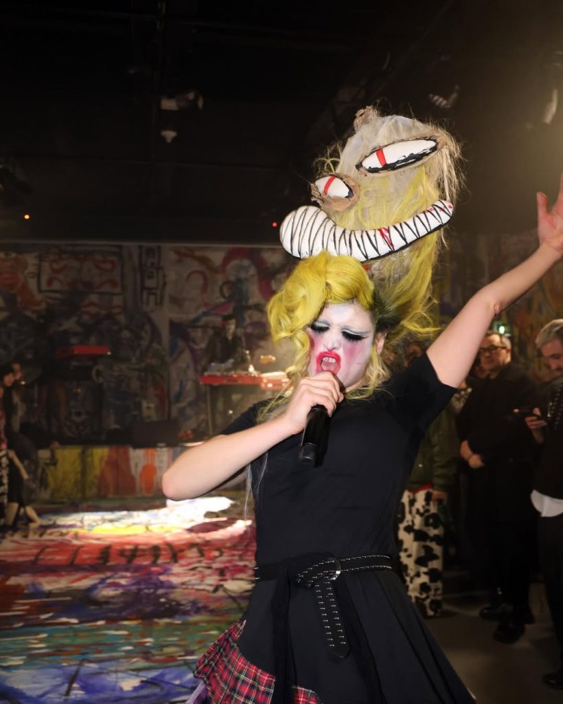 In de kelders van Dover Street Market in Parijs transformeerde de Britse ontwerper zijn officiële presentatie tot een immersieve ervaring. De band Baby Berserk speelde live, modellen bewogen op het ritme van de muziek, terwijl muren en vloer, bedekt met door de ontwerper zelf geschilderde doeken, een totaal scenografisch universum vormden.