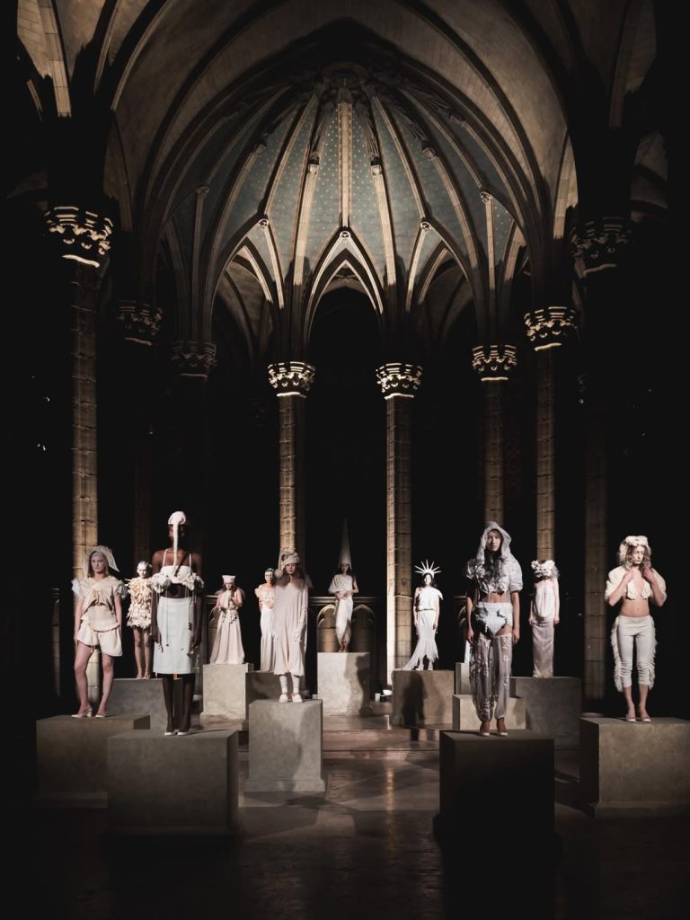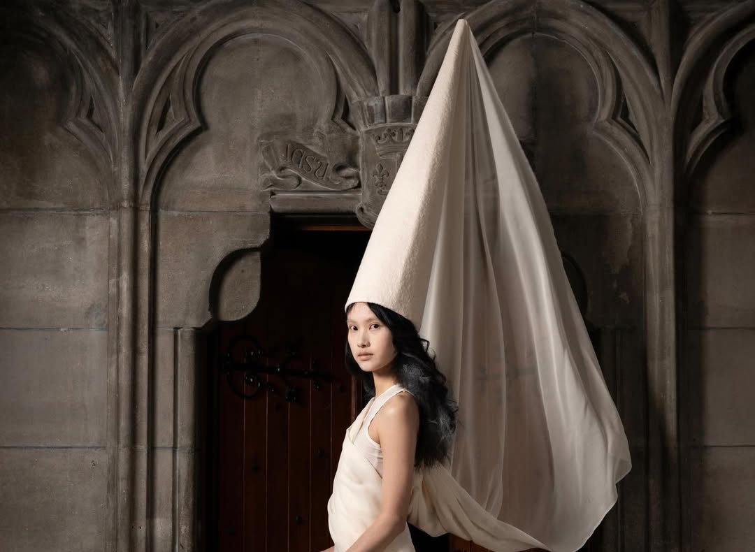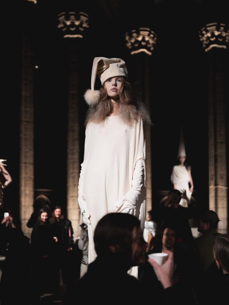 De volledig in wit gehulde silhouetten doen denken aan wezens uit een andere wereld. Fijne kant, maskers, hoorns, kappen en puntige hoeden vormen samen een dromerig universum. Hoewel de monochromie uniform lijkt, onderscheidt elke look zich door constructie en symboliek, als fragmenten van uiteenlopende verhalen.