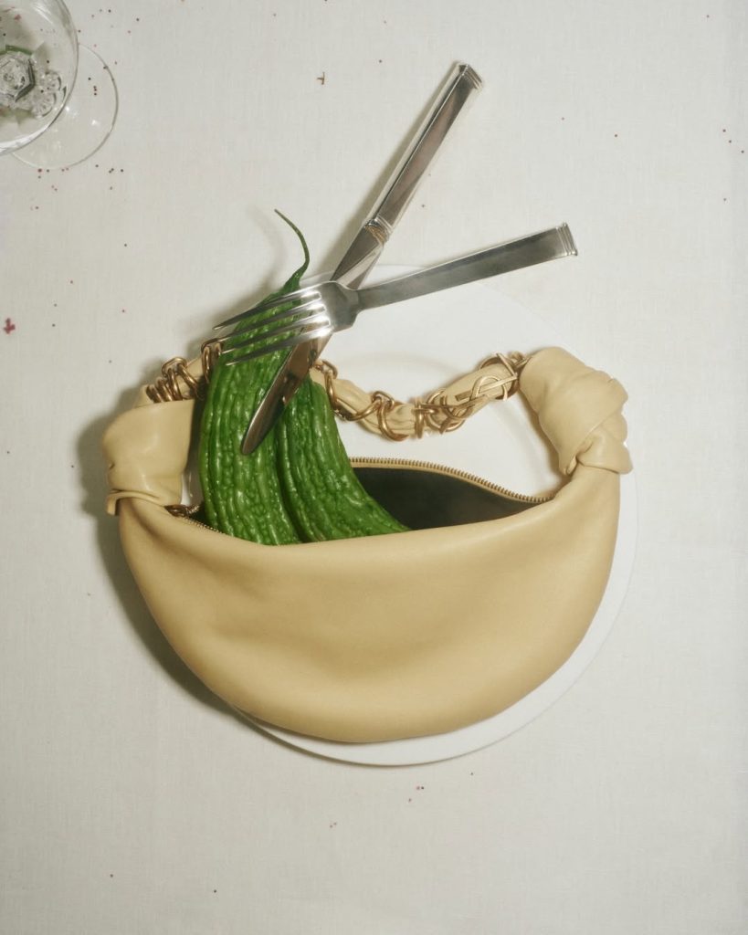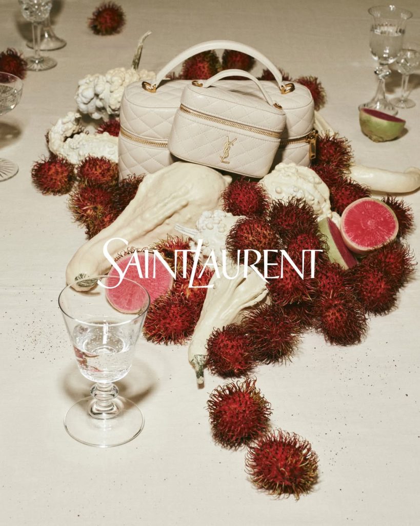 Andere huizen, waaronder Valentino en Saint Laurent, kiezen voor een meer intieme maar even creatieve aanpak. Hier wordt de kunst van het tafelen een expressieruimte. Iconische tassen en accessoires worden gepresenteerd in gastronomische scènes, omringd door verfijnde gerechten of zorgvuldig gerangschikte ingrediënten. Elke beeldcompositie wordt een klein theater waar luxe, culinaire verleiding en gezelligheid harmonieus samenkomen om op een subtiele en onweerstaanbare manier het eindejaar aan te kondigen.