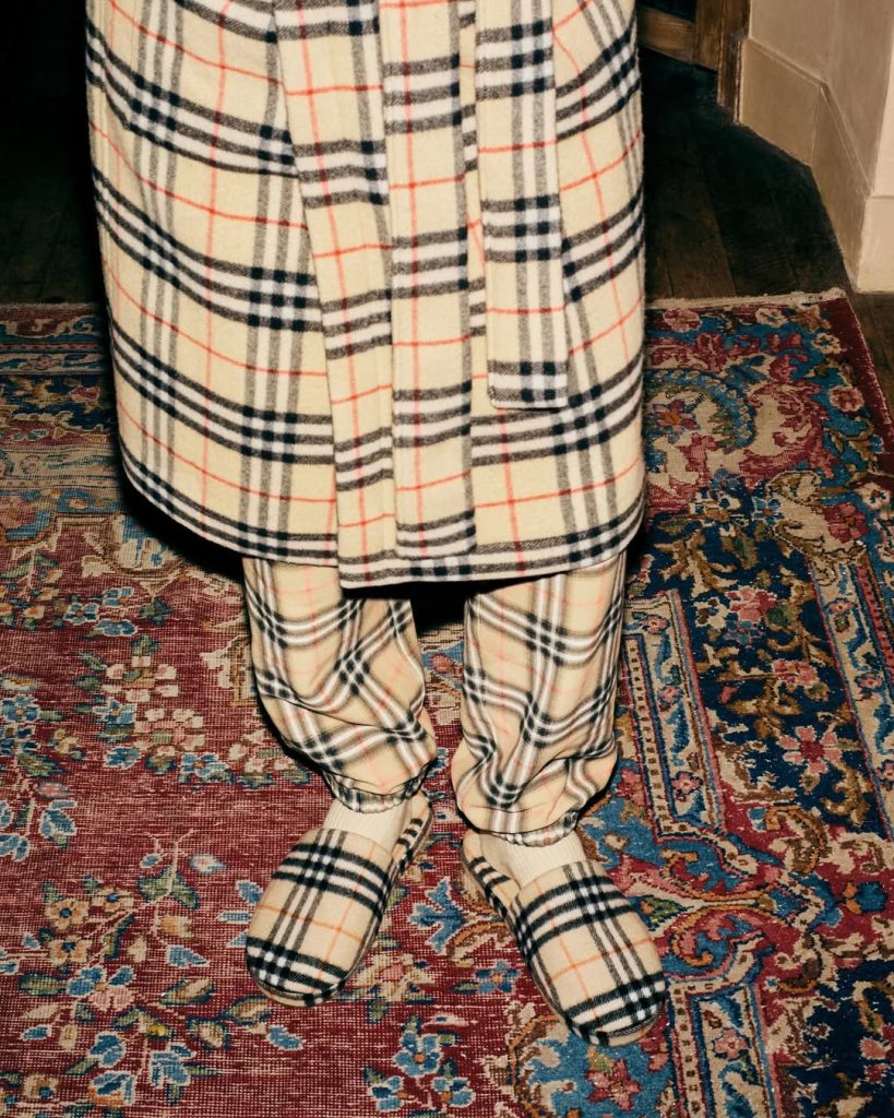 De iconische accessoires en signatuurstukken van Burberry zijn op een natuurlijke manier in het decor verweven. Kasjmieren sjaals, legendarische trenchcoats en verfijnde tartanaccenten vervolledigen het schilderachtige tableau.