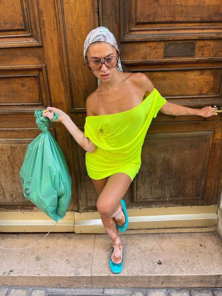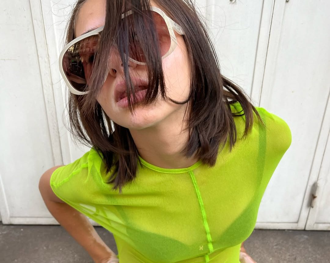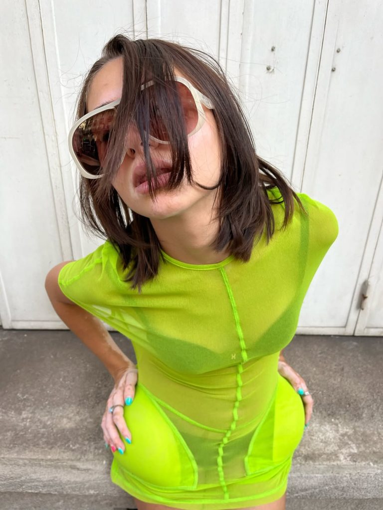 De opkomst van cunti cunta, een term geïntroduceerd door Loeva, medeoprichter van JUDE Party, kristalliseert een nieuwe manier om neon te benaderen. Deze houding positioneert zich lijnrecht tegenover de clean girl-esthetiek. Denk aan een asymmetrische jurk in zuur geel, een uitgesproken fluo minishort, een badpak à la Stabilo, XXL-juwelen met een rechtstreekse knipoog naar de jaren 80. Neon is hier geen detail, maar een instrument om met kitsch te spelen en een uitgesproken, kleurrijke identiteit te claimen.