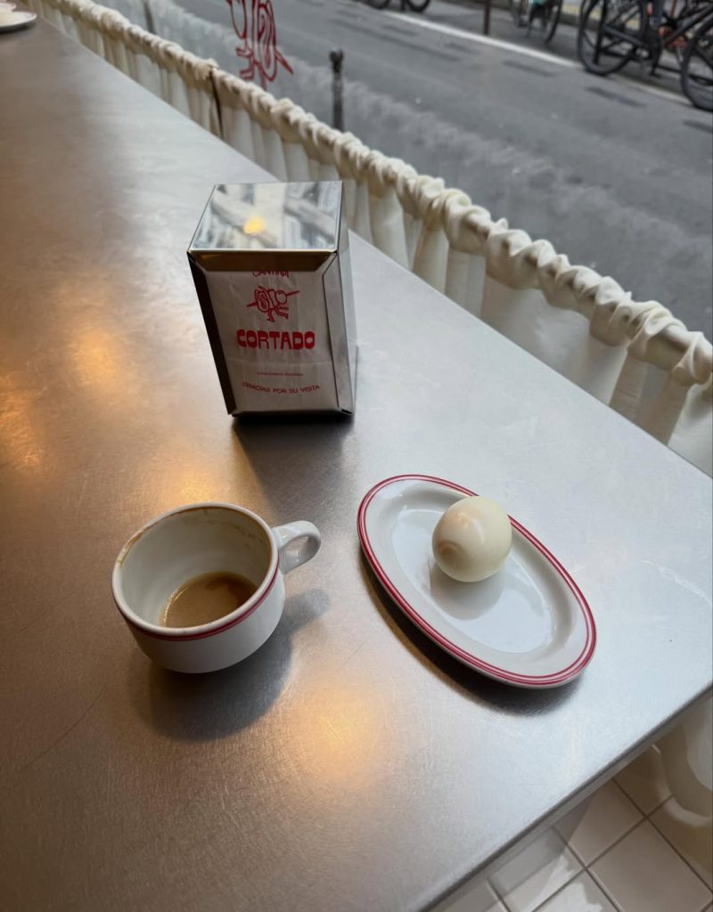 Fashion Week is ook het perfecte excuus om nieuwe plekken te ontdekken en vertrouwde adressen opnieuw op te zoeken. Cortado, een coffee shop en bar met Spaanse invloeden, profileert zich als een ideale tussenstop — voor een snelle espresso of een laat diner. Rosalía werd er al gespot, en het modepubliek is er vaste gast.